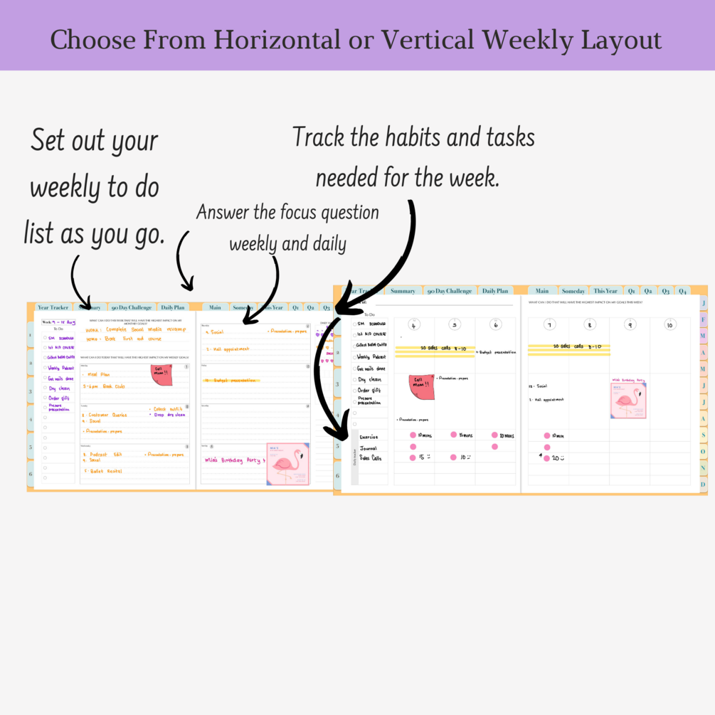*** Take action on a daily basis with a weekly spread. Begin with your daily focus question, and place your goals as a priority, while working around your to-do list.
